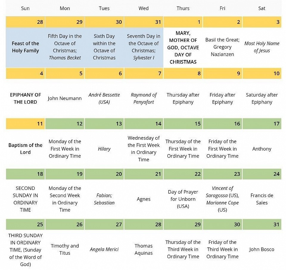 The remaining days of January are the beginning of liturgical season known as Tempus per Annum or Ordinary Time (formerly Time After Epiphany), which is represented by the liturgical color green. Green is a symbol of hope, as it is the color of the sprouting seed and arouses in the faithful the hope of reaping the eternal harvest of heaven, especially the hope of a glorious resurrection. The liturgical color green is worn during prayer of Offices and Masses of Ordinary Time.